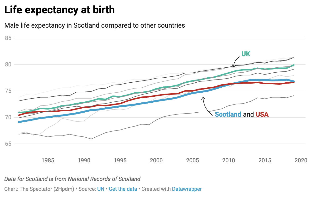The Nobel laureate Angus Deaton (himself Scottish-born) has written a book about America’s life expectancy problem in which he refers to ‘deaths of despair’ – due to drink, drugs and (to a far smaller extent) suicide. If someone of his calibre were to focus on Scotland we might have a better understanding of why things are going so wrong there.