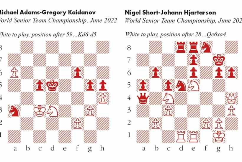 The World Senior Team Championship took place last month in Acqui Terme, Italy. England’s over-50s team got a boost from the addition of Michael Adams, who reached that milestone last year. With Nigel Short, Mark Hebden, John Emms and Keith Arkell, they began the event as top seeds. In the fourth round, they saw off a serious challenge from the second seeded USA, with its team of emigrants from the former USSR. Here is a key moment from that match, which ended in a 2-2 draw. The a6-pawn is dangerous, but Gregory Kaidanov is counting on the defensive resource 60 a7? Nb5+. Adams finds an unexpected breakthrough on the other side.