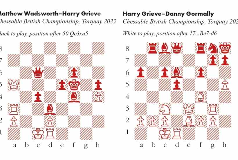 Hats off to Harry Grieve, who took clear first place at the Chessable British Championships which concluded in Torquay last Sunday. I am in awe of the courage he showed in the final round game, against the international master Matthew Wadsworth. Grieve set the tone in the opening, sacrificing rook for bishop, but gaining long-term compensation. Wadsworth reacted well, but let his advantage slip, whereupon Grieve doubled up his investment. After several hours’ play, they reached the murky position shown below.