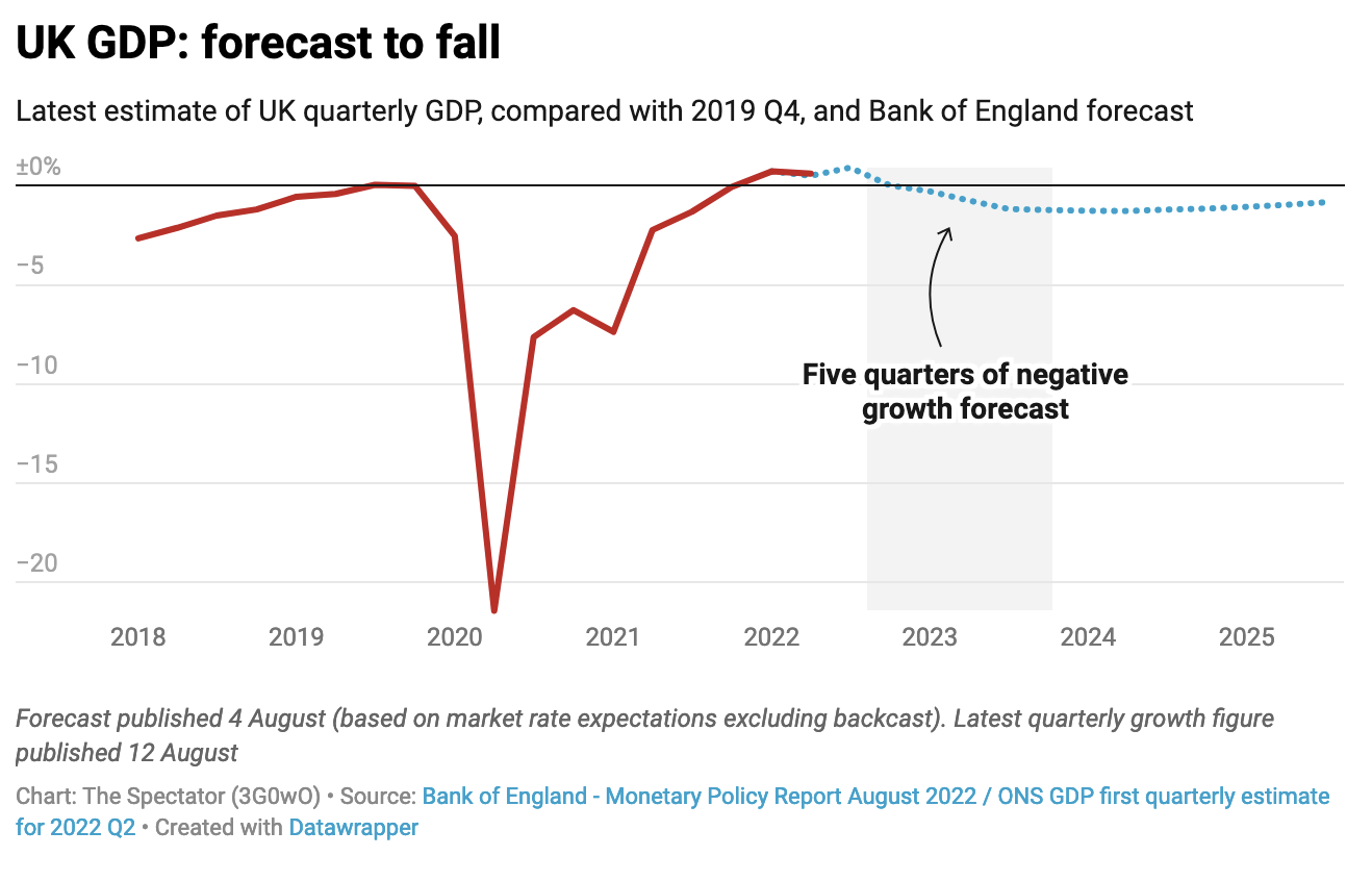 The Bank of England recently raised hackles by predicting that the economy would shrink in the final quarter of 2022, with Britain spending the whole of next year in recession. Liz Truss was especially critical, saying that a recession was not inevitable. In last night’s Cheltenham debate she again referred to the subject, saying that it was important we did not ‘talk ourselves into a recession’.