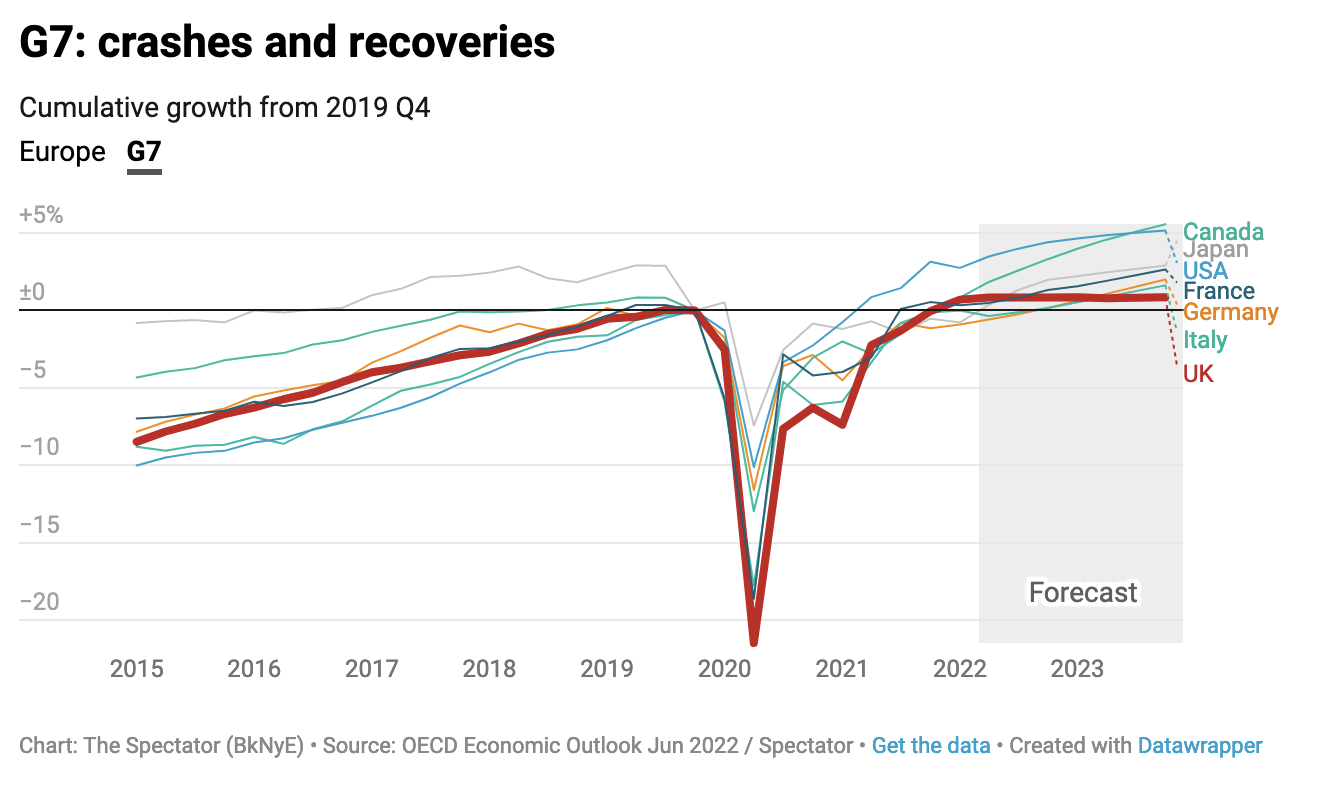 So far, six G7 countries have announced their GDP figures for the second quarter. Only Britain and the US showed a fall. Germany was flat, France was up 0.5 per cent, Italy 1 per cent and Canada 1.1 per cent. Japan has yet to report its GDP figures for the second quarter. The contrast between Britain and the large EU economies may excite Remainers, but then the French economy shrank in the first quarter, when the UK economy was still growing. The Italian economy, too, has been more sluggish than Britain’s economy since the pandemic.