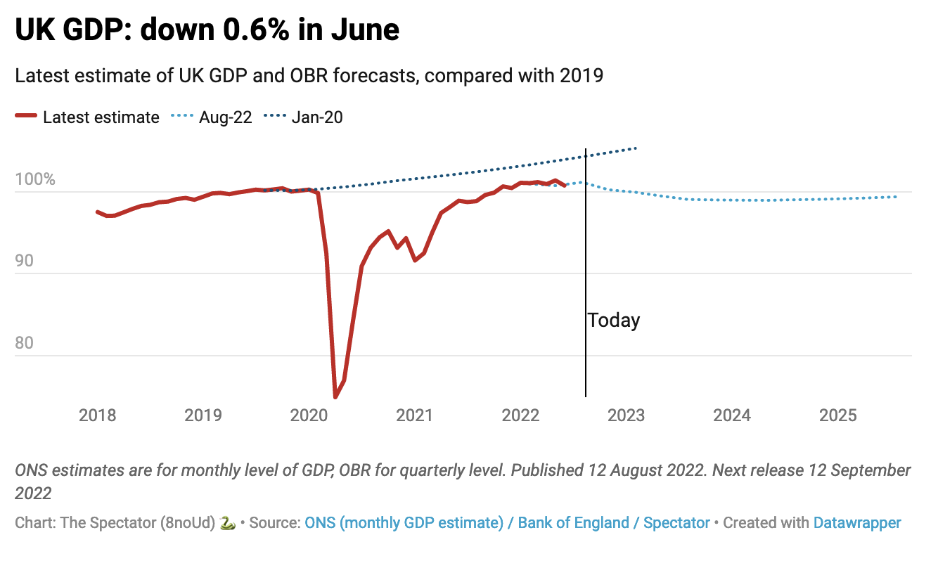 But could a recession arrive actually earlier than the Bank of England predicted? This morning’s figures from the Office for National Statistics (ONS) suggest that the economy shrank by 0.1 per cent in the second quarter of this year. If the figures for the third quarter, due in October, also show a fall then Britain could officially be in recession by then. It would not be the first major industrialised country to fall into recession: the US has already recorded two consecutive quarters of negative growth, the traditional and most widely-used definition of a recession – although Joe Biden, aided by Wikipedia, has sought to change this definition to save his blushes.