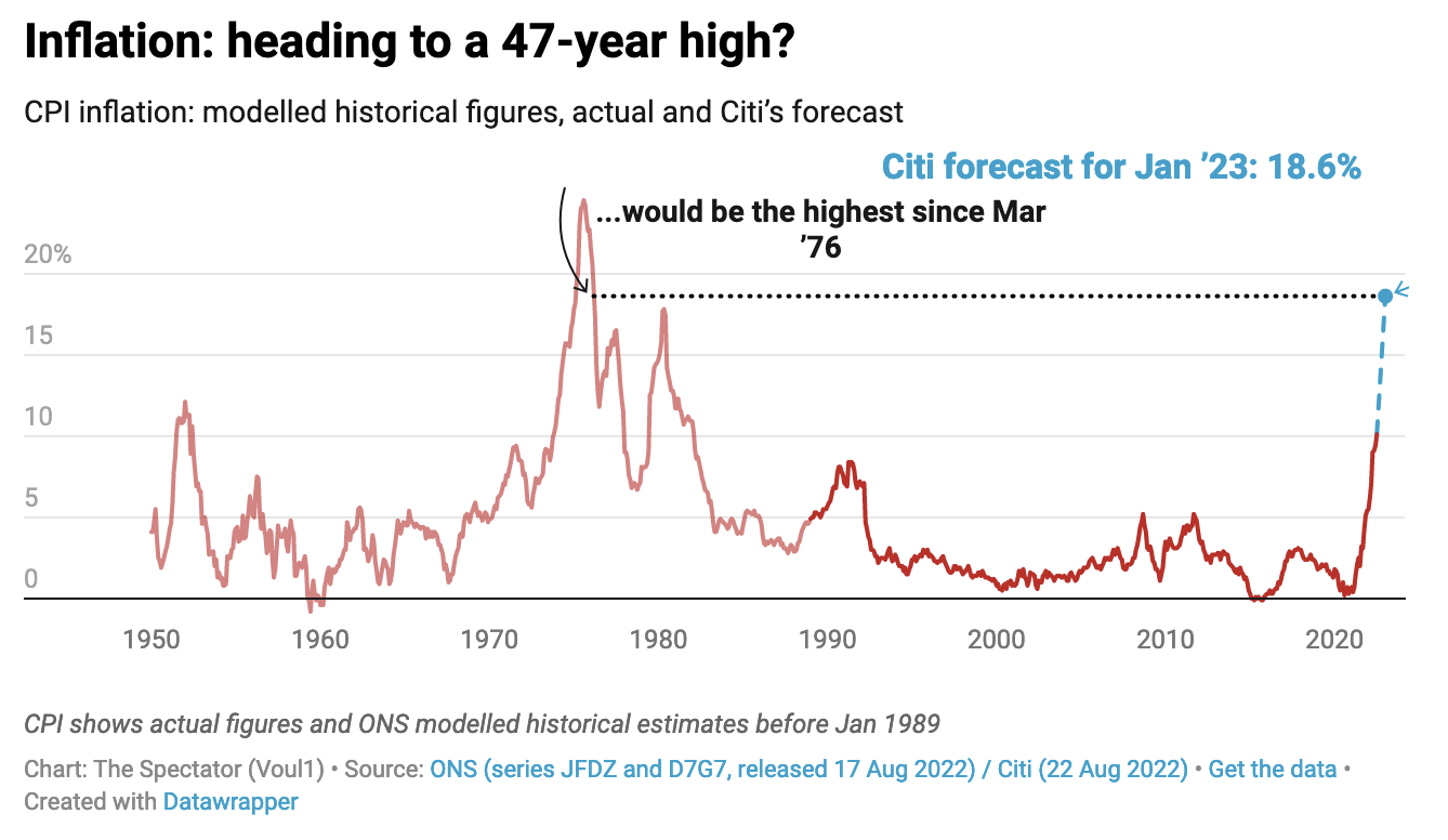 While Citi’s number is on the high end of the forecast spectrum, it is by no means alone in exceeding the BoE’s estimates, as both EY and Goldman Sachs expect inflation to peak at least 3 percentage points higher than the Bank. But the numbers this morning build up even more concern around the next energy price cap this Friday, which is expected to hit around £3,500. As Katy Balls writes, this puts leadership candidates Liz Truss and Rishi Sunak under far greater pressure to make public the relief packages they are considering to help struggling households. But if inflation comes anywhere close to Citi’s predictions, our understanding of the economic pain to come is going to shift radically once again.