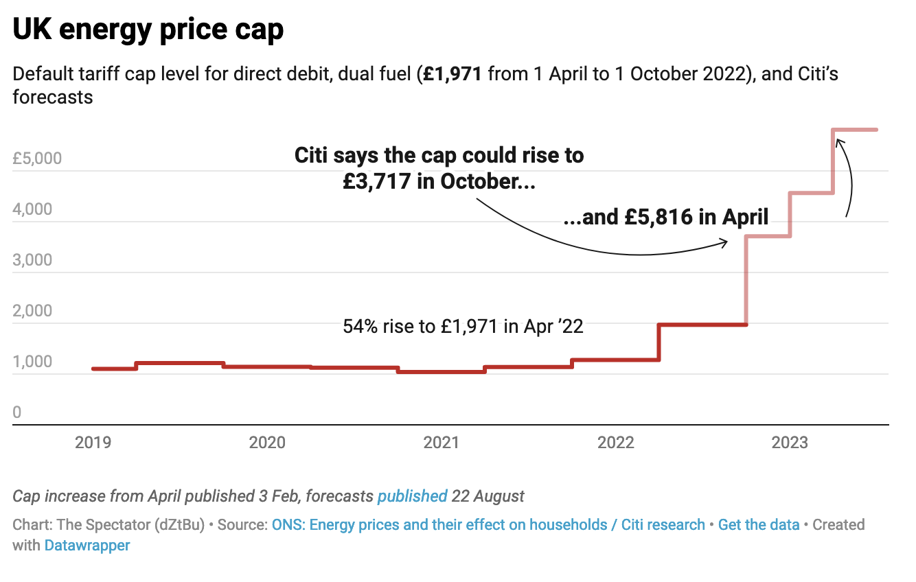 Citi’s figure, reported by the Financial Times, comes from its predictions around the energy price cap rises in the new year: it expects the cap to rise to £4,567 in January and then by a further £1,000 in April. These rises, Citi claims, will see inflation ‘entering the stratosphere’.