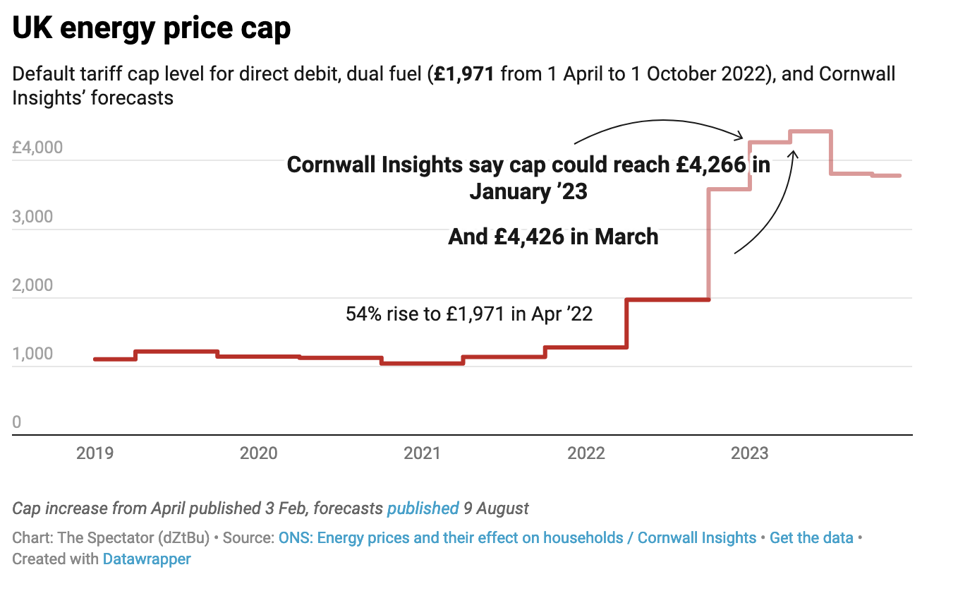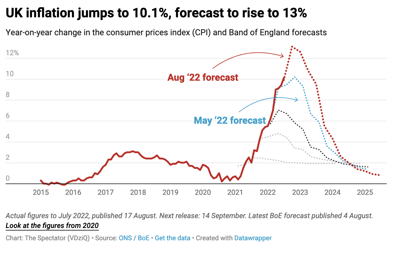 First, concerns are rising that the Bank of England has, yet again, been too optimistic about when and at what figure inflation might peak. This has been a trend throughout the inflation crisis: the BoE’s forecasts have only been revised upwards so far, as it becomes clear that prices go beyond their expectations. This time last year, most of Whitehall was still in complete denial about the price hikes that were about to shake the UK. Since then it’s been a game of catch-up and a fairly unsuccessful one at that. Capital Economics predicts that today’s 10.1 per cent will put pressure on the Bank to go for another 0.5 percentage point interest rate rise in September, as the need to curb these price hikes intensifies. Market expectations (tracked on The Spectator data hub) are currently that rates will peak around 3.25 per cent, but staying above 2 per cent for the foreseeable future.