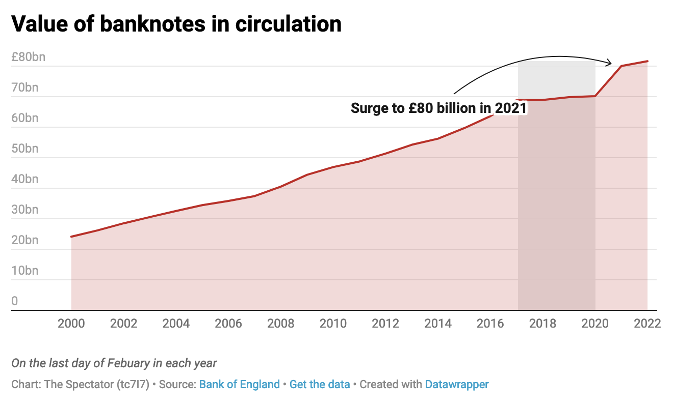 Of course, we shouldn’t read too much into figures from the Post Office alone, to which some people may have turned as a result of their local bank branch having closed or their nearest cashpoint having been removed. But the Bank of England’s statistics on banknotes in circulation show a similar story. Between 2017 and 2020, the value of banknotes appeared to have plateaued, reaching £70.1 billion in 2020. And then? There was a huge surge to £80 billion in 2021 followed by a further increase to £81.6 billion in 2022.