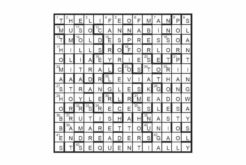 The unclued lights 11 SOLITARY, 8 POOR, 38 NASTY, 36 BRUTISH and 35 SHORT are descriptions of 1 THE LIFE OF MAN in 26 LEVIATHAN by 13 THOMAS HOBBES.
