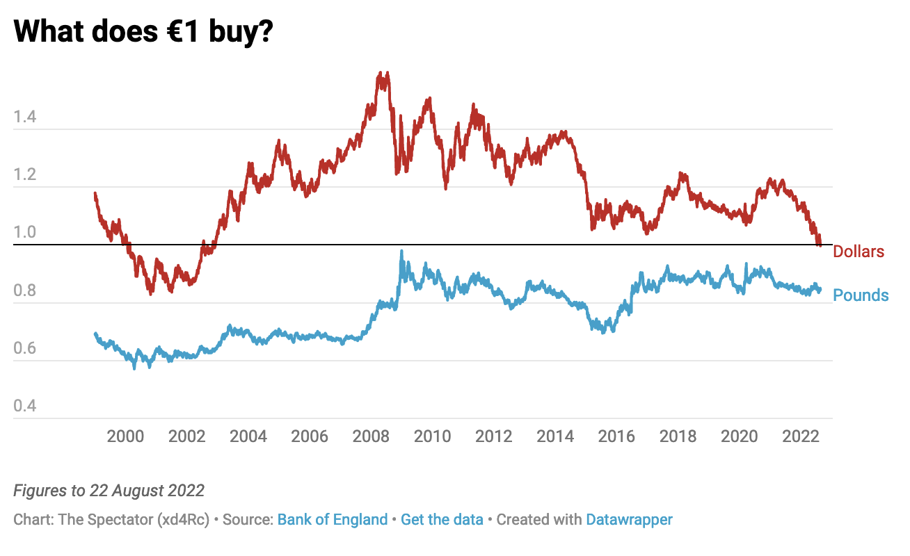 Since June 2016 we have settled into a pattern. Whenever the pound plunges, it is followed by cries of ‘I told you so’. It is all the fault of Brexit and a result of international investors fleeing Britain and taking their money elsewhere. And when the euro plunges? We hardly hear a thing. Yet today, the euro has passed a milestone which ought not to be ignored: it has fallen below parity with the dollar for the first time since 2002. It is quite a tumble given that in 2008 it was trading at $1.5. Against the pound, the euro is now back to where it was in 2012, long before Britain’s departure from the EU became a serious prospect.