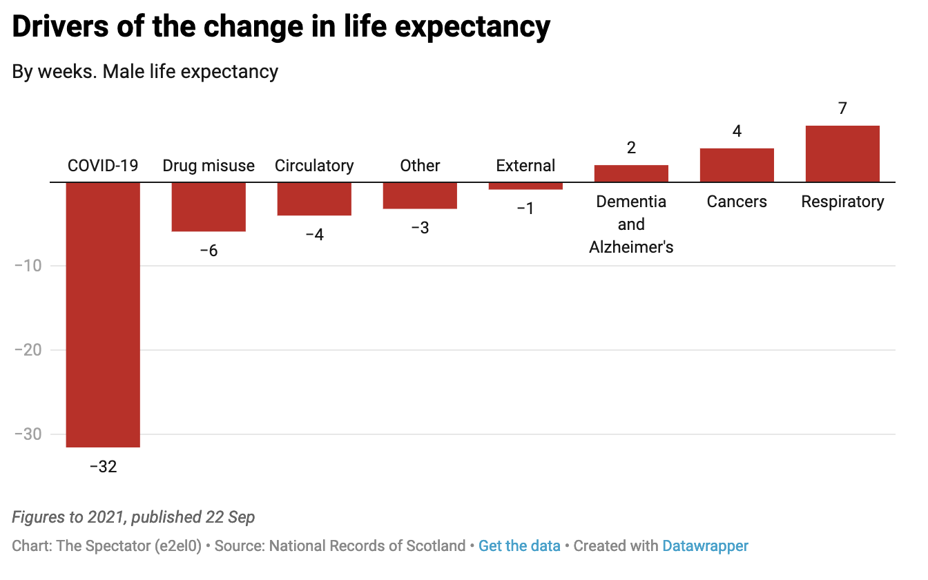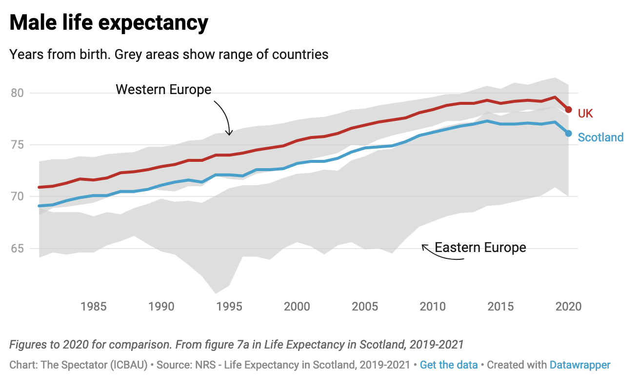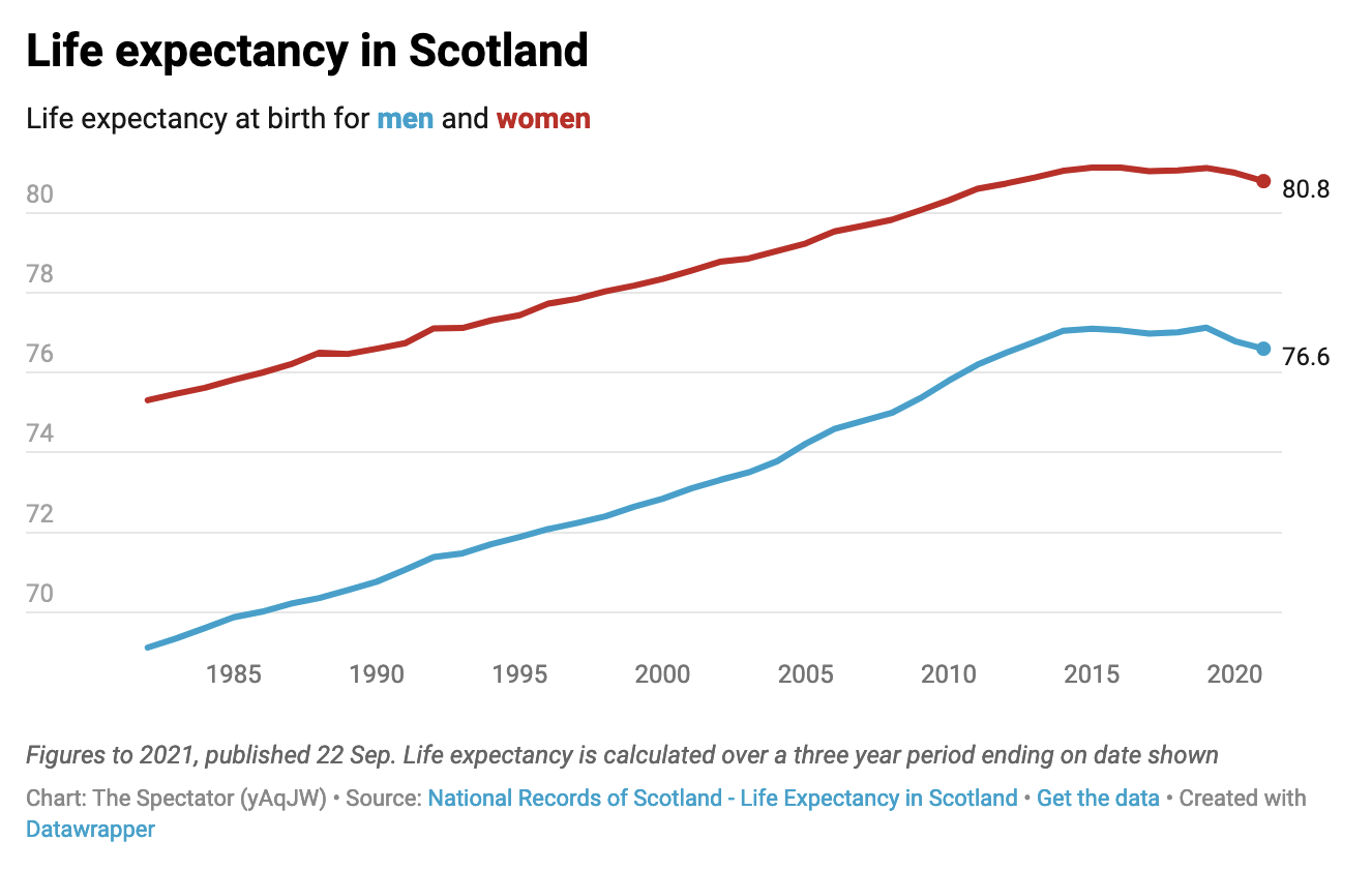 Even before the pandemic, life expectancy was stalling. It hasn’t significantly improved in Scotland for the past eight years. When I worked for the National Records of Scotland, who produce the life expectancy statistics, some of my colleagues were put on ‘working groups’ to get to the bottom of life expectancy figures that were flatlining. But then the pandemic came along and provided an easy solution: blame it all on Covid.