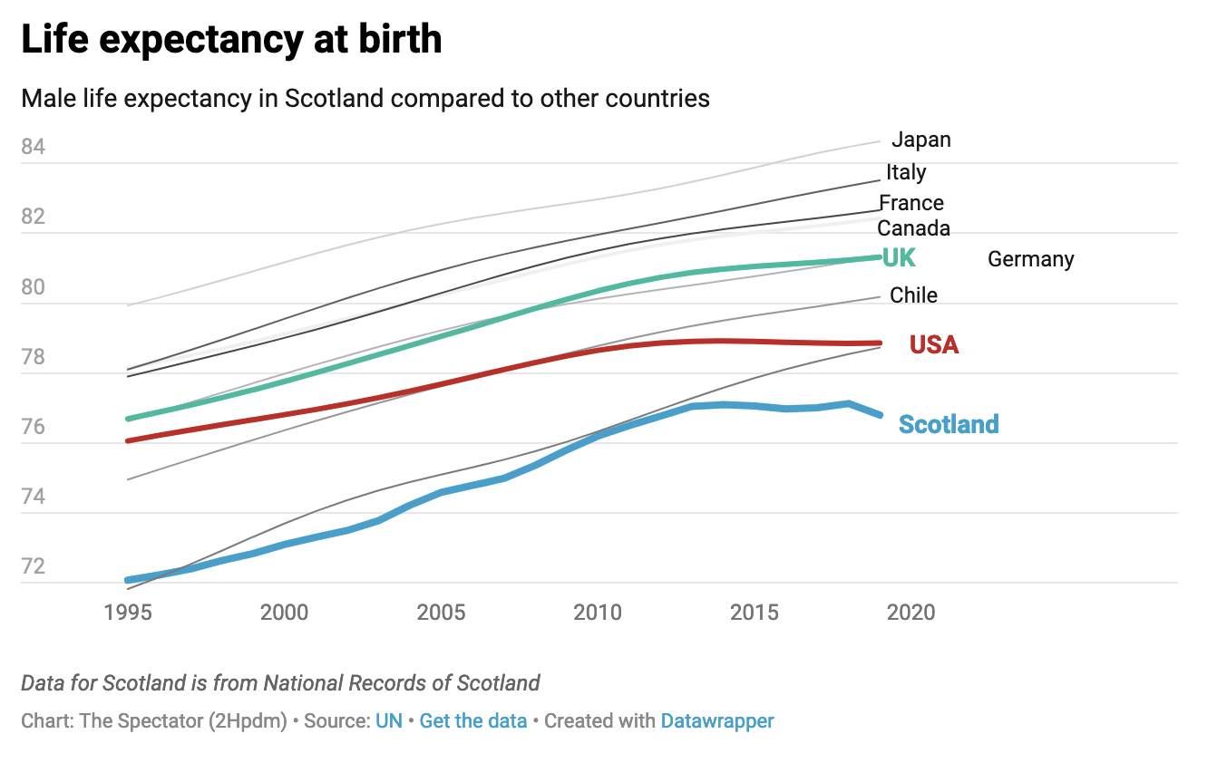 This is mainly a sign of deprivation, and what has been called the most expensive poverty in the world because of the cost of the country’s welfare state. In Glasgow, where parts of my family are from, life expectancy is just 73 – on a par with the Gaza Strip and Syria. And that’s an average which includes the city’s lush West End: go east and you can find places where life expectancy is in the 60s.