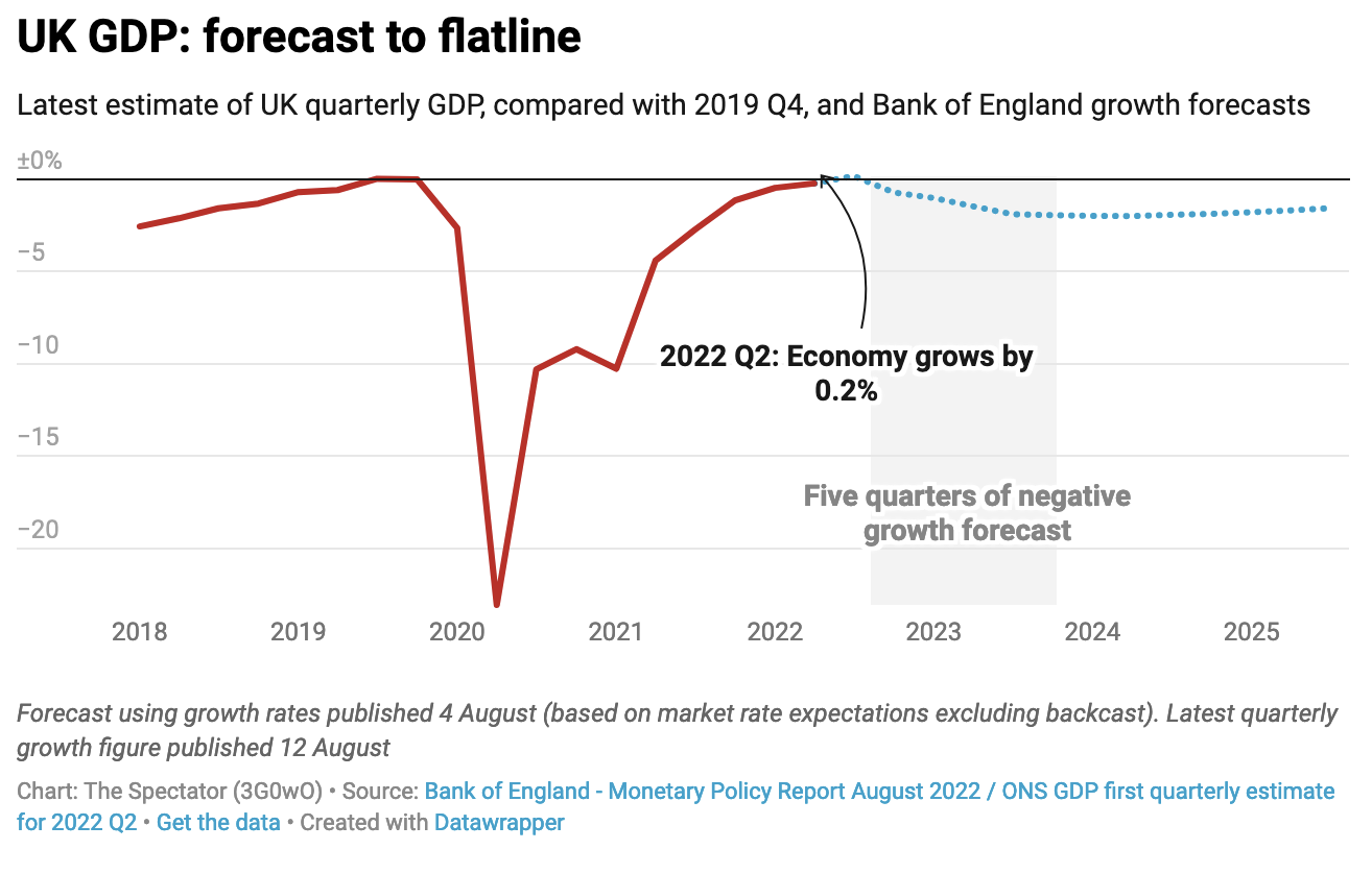 Why the hike? It’s thought that the Office for Budget Responsibility (which was cast aside for the mini-Budget but will be on full show for the Autumn Statement) will be downgrading its growth forecast for the economy. Given recent forecasts have been pretty gloomy, this spells bad news for Britain. The most recent predictions from the Bank of England show growth flatlining for not just months, but years to come. While the UK has so far avoided two consecutive quarters of negative growth, Ross Clark notes on Coffee House that evidence of the economy dipping into recession this autumn is already leaking through.