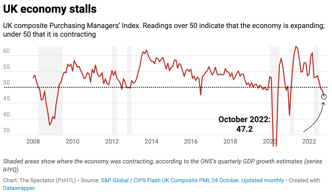 The UK’s S&P Global PMI for October is put at 47.2, significantly lower than the market expectations of 48.2 – and the lowest since January last year, the beginning of the third Covid lockdown. And lockdowns aside, it is the lowest figure recorded since March 2009 – when Britain was in the depths of the financial crisis. Manufacturing, at 45.8, is especially low, with the outlook deteriorating sharply in the past month; it was 48.4 in September. And the services element of PMI is in negative territory for the first time in 20 months.