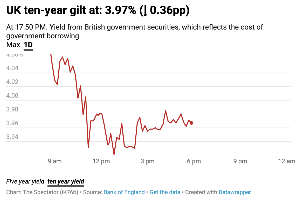 The government’s position has become so precarious – and its credibility with the markets so low – that even waiting another two weeks to announce the ‘medium term fiscal statement’ became too big a gamble. By moving the announcement forward to today, Jeremy Hunt is removing the uncertainty of creating a two-week gap between the end of the Bank of England’s intervention in the gilt market and the government’s announcements. And markets are tentatively responding well. Ten-year gilt yields started dropping considerably when the market opened at 8 a.m., from 4.3 per cent down to just under 4.1 per cent. You can follow along with hourly updates via The Spectator’s data tracker here.
