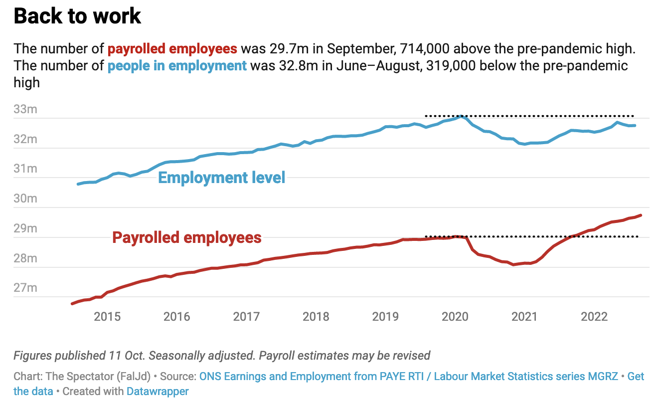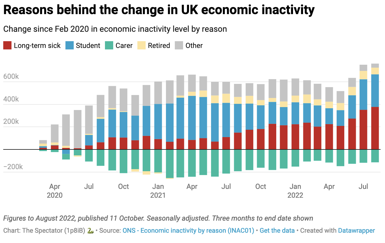 In response to this morning’s unemployment figures the Chancellor Kwasi Kwarteng claimed: ‘the fundamentals of the UK economy remain resilient’. There is indeed some tentative good news, especially around increasing payrolls. But it’s hard to see much resilience in a working population that’s falling ill in record numbers. Until that changes, inactivity is unlikely to do anything other than continue to increase.