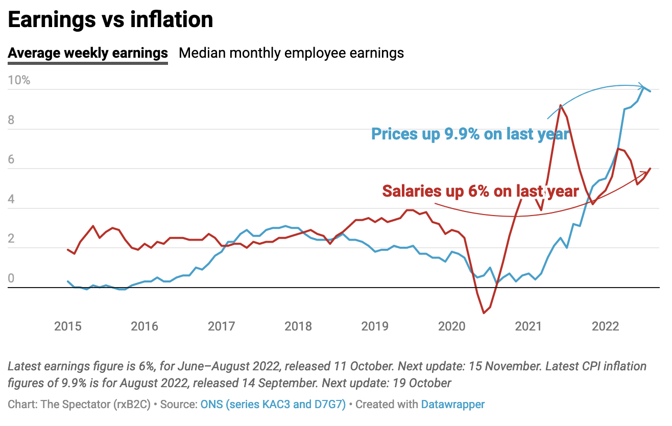 There are also some early signs that the jobs market is starting to cool. There were some 1.25 million vacancies in September, compared to 1.26 million the month before. It’s a small fall, but it’s the fourth monthly fall in a row, reducing from a peak of 1.3 million jobs. Meanwhile earnings increased six per cent year on year, though this is still well below inflation, which currently sits at 9.9 per cent on the year. As a result the average worker is experiencing a three per cent pay cut.