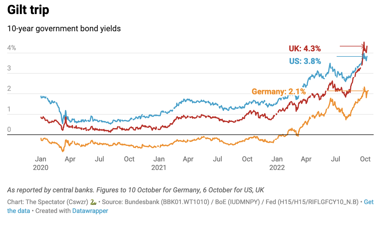 Yesterday gilts were going in the right direction. Five-year yields finished the day 0.31 percentage points lower than where they started. Ten-year yields dropped even more. As Ross Clark reported yesterday, this was likely down to pension funds offloading gilts they needed to get rid of to raise cash in the nick of time. Perhaps they had heeded Bank governor Bailey’s ‘you’ve got three days left now. You have got to get this done’ warning. Despite this, yields are still far higher than where they have been for most of the year. It shouldn’t be long before we know what direction they’ll travel in today.