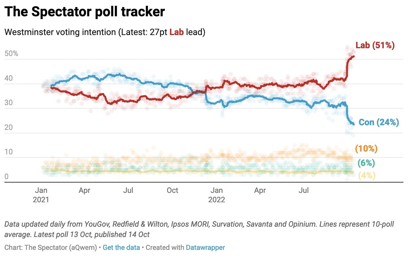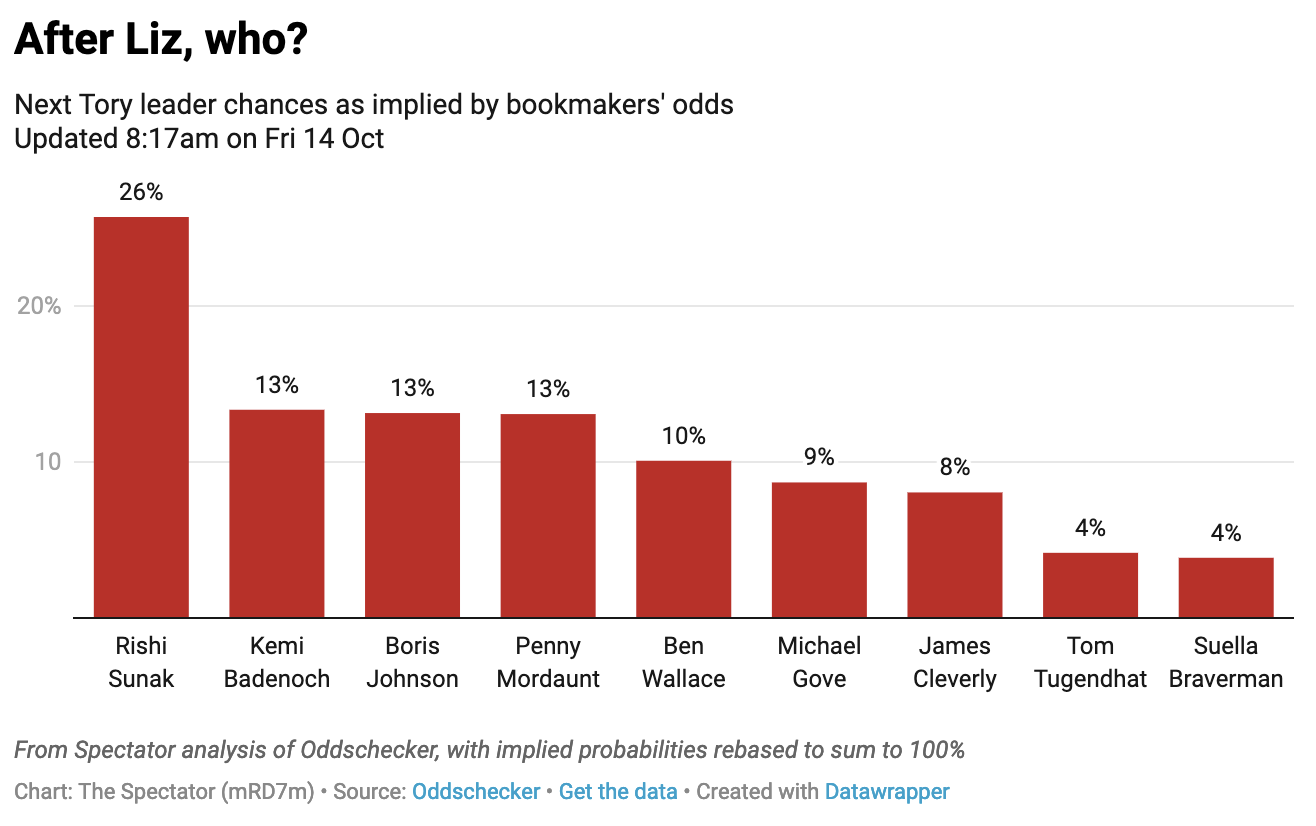 It was reported last night that senior Tories are gearing up for a Rishi Sunak and Penny Maurdaunt ‘unity’ ticket. This would be not so much in the hope that they’ll turn the polls around and win the next election, but that they’ll lead to a loss that isn’t so great as to finish off the party for good. That would be in line with what gamblers think. Sunak is the current favourite to replace Truss with a 26 per cent chance. Mordaunt is fourth with a 13 per cent chance. One other market to keep an eye on: some bookies are offering 6 to 1 odds that a 60p lettuce with a ten-day shelf-life will outlast the PM.
