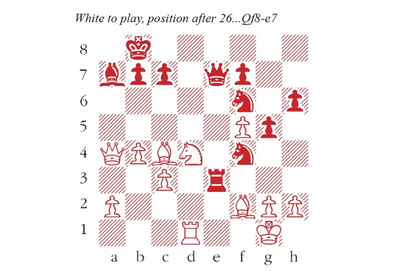27 Bxe3 Qxe3+ Now 28 Kh1 Bxd4 29 cxd4 Ng4 would create overwhelming threats. One delightful variation runs 30 Rf1 Qe4 31 Rf3 Nh3! 32 Bf1 Qe3! 33 Rxe3 Ngf2 mate. 28 Kf1In this position, Carlsen had presumably counted on 28… Ng4, with mate threats on f2 and h2, but then spotted that 29 Nc6+! turns the tables: 29… bxc6 30 Rd8+ Kb7 31 Qa6 mate. No better is 28… Bxd4 29 Rxd4 Qc1+ 30 Rd1, followed by Rd8+. So he sank into thought for a minute and a half, and found the only winning move. N4d5! A brilliant measure, which forcibly blocks the d-file and thus renews the threat of Nf6-g4. 29 Bxd5 White loses in all variations, e.g. 29 Re1 Qf4+ 30 Kg1 Bxd4+ 31 cxd4 Qxd4+ followed by Qxc4. But 29 Be2 is less easy to refute. The strongest response is 29… g4! which prepares Qf4+, without allowing bishop or knight to block the check) 30 g3 c6! (preparing Nf6-e4 without allowing Qe8+) 31 Rd3 Qe4 32 Ke1 Qh1+ 33 Bf1 Bxd4 34 cxd4 Qxh2 and Nf6-e4 is coming, so White is lost. Ng4 With the d-file closed, 30 Nc6+ does nothing, so White resigns.