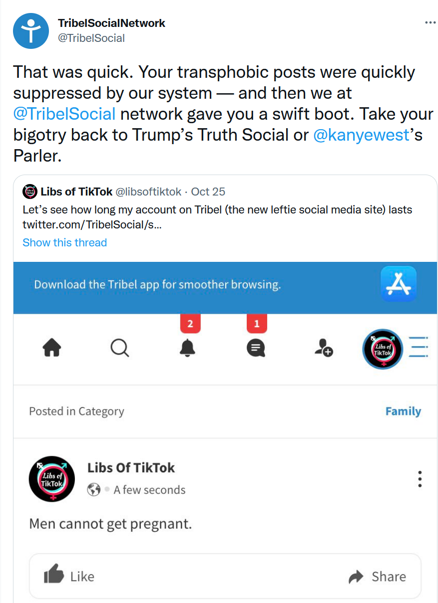 Tribel gave the world a working example of their moral logic and censorial power when Libs of TikTok set up an account to state an established biological fact ‘men cannot get pregnant’ and received a near immediate gloating message from Tribel: