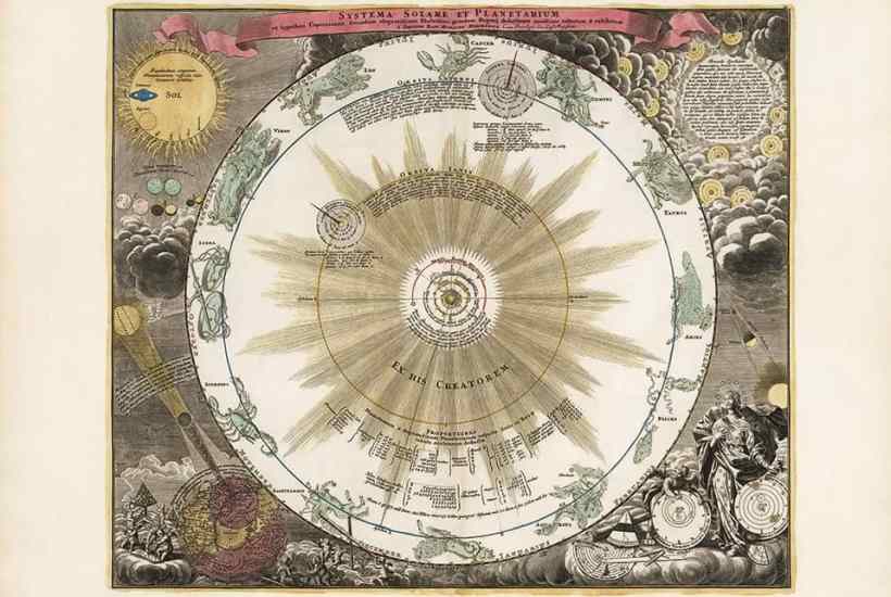 This is a book ultimately as accessible to the non-scientist as it is to the specialist. Doppelmayr’s mathematical notations of the motions of the planets, the charts of loops, parabolas and ellipses might at first seem a baffling panorama of unknowing. With Sparrow’s help, however, they give up a story of increasing fascination. Take the development of heliocentric theory. Before Copernicus, with the odd exception, the Earth was thought to be the unmoving point at the centre of a revolving universe, a system apparently endorsed in the Book of Joshua, where God makes the orbiting sun stand still. Doppelmayr gives us the charts that demonstrate how successive astronomers struggled to uphold a geocentric cosmos while acknowledging the merit of the Copernican idea. Increasingly complicated theories were propounded before overwhelming evidence won the day. This narrative is told both in diagrams and through the illustrations that decorate his pages. Engravings of astronomical instruments, telescopes and astrolabes, armillaries and sextants – in use by putti – abound. Portraits of the titans of astronomy – Ptolemy, Copernicus, Tycho Brahe, Kepler – are set among the stars. The great observatories in Denmark, Paris, London and Berlin appear in corners, fascinating in their details.