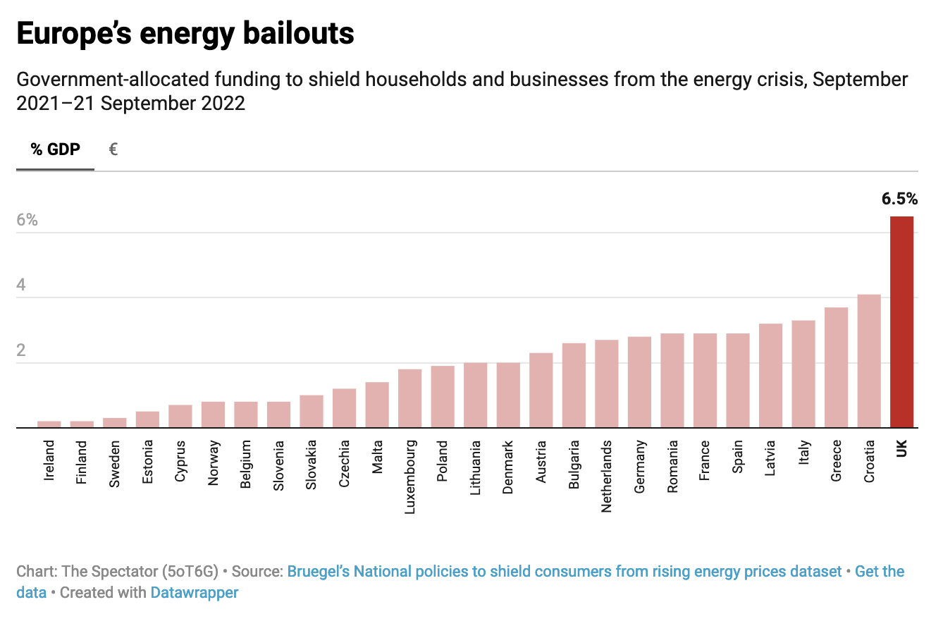 First, a key problem with the energy package is its open-ended scale. In a tweet on Thursday the Chief Secretary to the Treasury, Chris Philp, boasted that the UK’s energy support package involves around twice as much taxpayer support for energy prices, relative to GDP, as the schemes of our European neighbours affected by much the same crisis.