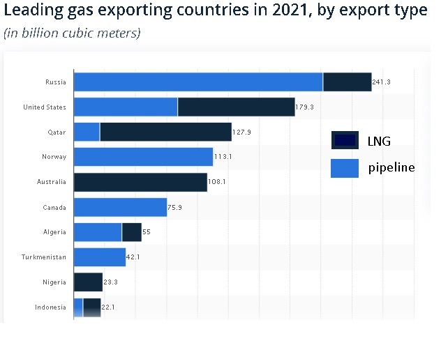In 2021, Russian pipelines supplied Europe with 200 bcm of natural gas. By comparison Australian LNG exports totalled 108 bcm. While Australia tops a ‘world’s largest exporter’ list, this applies only to LNG. Gas delivered by pipeline is a separate list – topped by Russia, with second place to Norway, then USA and Canada.