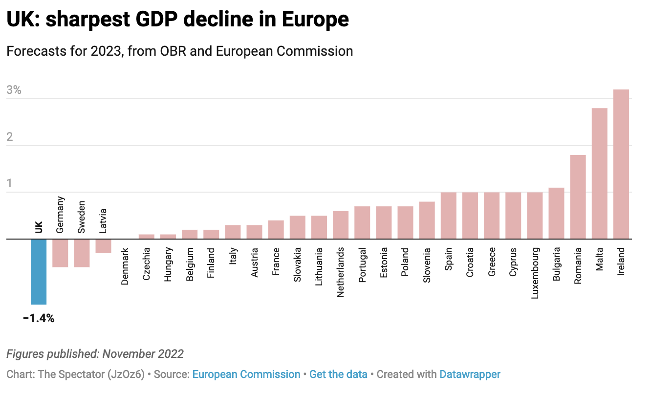 The economic forecast from the Office for Budget Responsibility suggests the UK is already in a recession, echoing the Bank of England’s predictions for a shallow yet long downturn. The OBR’s forecasts are slightly more optimistic, showing five consecutive quarters of negative growth compared with the Bank’s eight. Still, the OBR’s predictions show the UK experiencing the sharpest economic contraction in Europe next year.