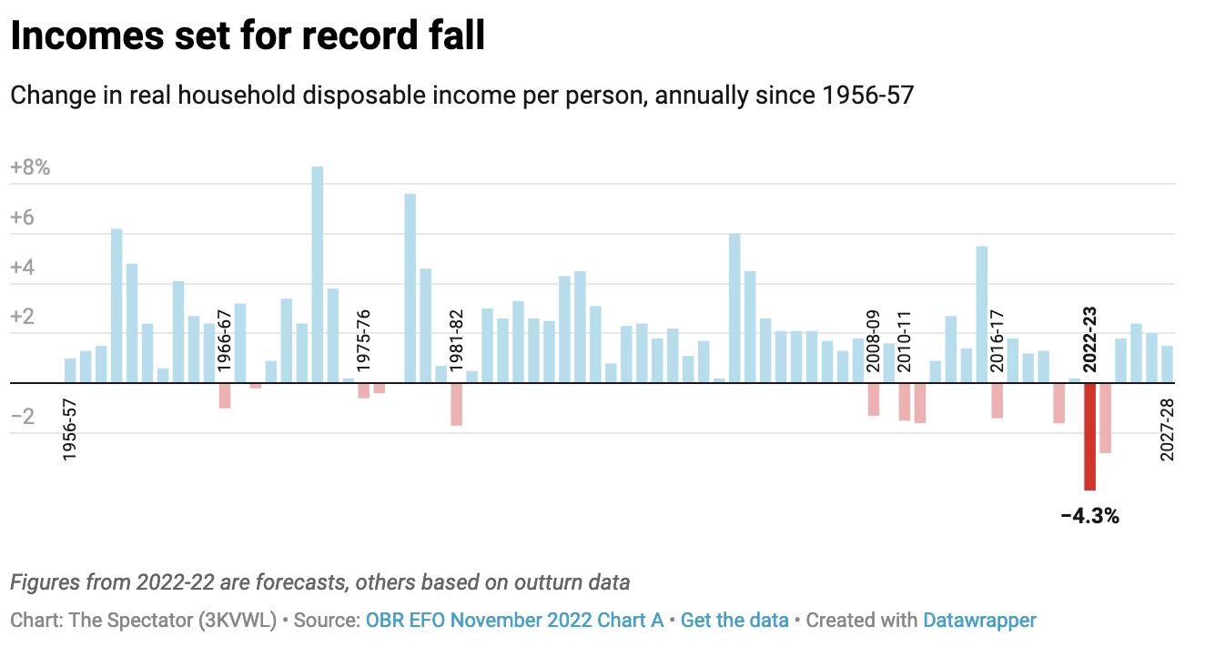 Inflation is expected to remain more than triple the Bank’s target next year, averaging 7.4 per cent. As price hikes eat away at savings, wages are taking a substantial hit, too. The OBR estimates we are now looking at the biggest fall in living standards in post-war history.