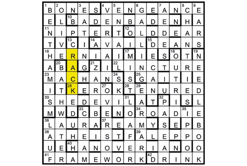 The word is ‘rack’. In the order of the headwords in Chambers, their meanings are indicated by: FRAMEWORK (41), VENGEANCE (4A), DECANT (15D), BONES (1A), GAIT (25), MIST (17), DRINK (42) and SKIN (24). RACK in CRACKED (13) was to be shaded, Title: a further meaning of rack1.