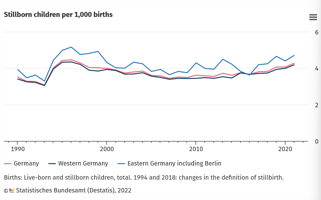The Destatis records extend to July 15, 2022 and report that the ‘number of stillbirths per 1,000 births rose from an all-time low of 3.5 in 2007 to 4.3 in 2021’ with the hike in deaths occurring in mothers of all ages and uniform across Western and Eastern Germany.