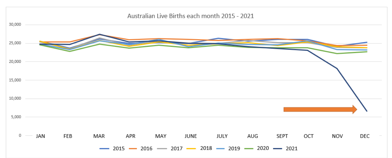 The ABS data cited by Senator Roberts indeed shows that, after an uneventful first 10 months, registrations of births (by date of occurrence) were lower in the last two months of 2021.