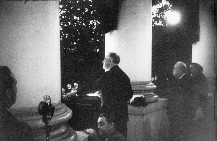 The effect was instantaneous, electric. The cheers swelled into a roar. Usually restrained Harlan Fiske Stone, chief justice of the United States, raised his arm in a return salute… and fingers spread in the victory sign were raised in scores of places throughout the chamber.