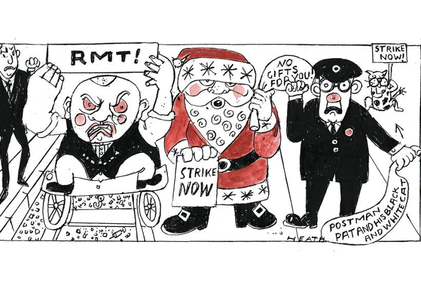 My other adult human is at university in Manchester. A short train ride away – or an eight-hour round trip by car, which, thanks to Mick Lynch, I shall be forced to undertake this Christmas. She spends her life waiting for news of rail strikes so she can book tickets home – no point otherwise, as it’s impossible to get the money back. As soon as Lynch announced the latest round – 13-17 December, then 24-27 December, and finally 3-7 January, expertly timed to ruin everyone’s Christmas travel plans – my daughter jumped straight on to the train app, only to discover everything either side of those dates had already sold out. Same with the coach, and flights are wildly expensive. She can’t even post herself home, either, since Royal Mail is on strike too. Mum’s Uber it is, then, along, no doubt, with half the country. It’ll be gridlock. So much for the left’s commitment to net zero.