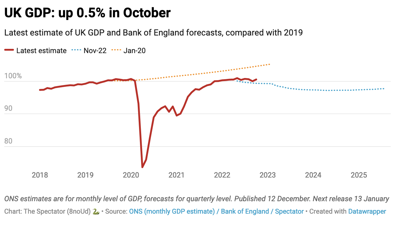 Have the prospects of a recession been overstated? That would be the most optimistic reading of this morning’s update from the Office for National Statistics, which released the latest set of monthly GDP data showing 0.5 per cent growth in October. This is the biggest monthly rise since January, when the economy was bouncing back from a voluntary slowdown in activity when the Omicron variant of Covid hit last Christmas.