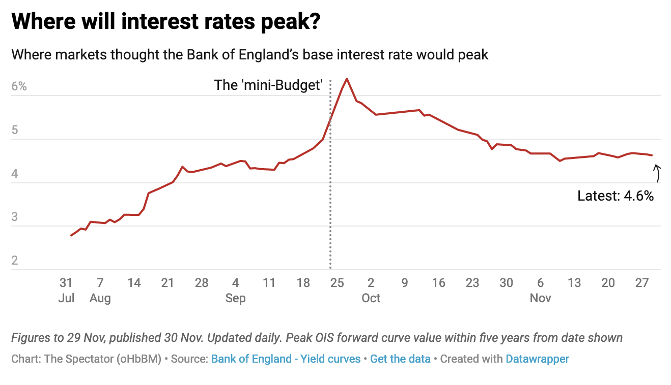 Nationwide now puts the average house price at £263,788, nearly £4,500 less than in October. This is, it says, a basic function of the rising cost of borrowing (a worldwide trend, briefly exacerbated in the UK by the Truss debacle). But at one point back then, the markets feared Bank of England base rates would hit 6.5 per cent: now they’re expected to peak at just under 4.7 per cent next summer. House buyers will see a slightly higher peak of 5 per cent around a year later according to the OBR.