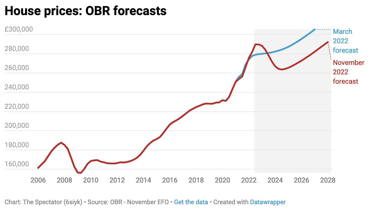 The Nationwide index is one of many house price metrics. One forecaster, Capital Economics, expects house prices to fall 12 per cent before 2024. The OBR goes for a smaller figure, saying house prices will ‘fall by 9 per cent between the fourth quarter of 2022 and the third quarter of 2024’, blaming rising rates and a recession believed to have started already.
