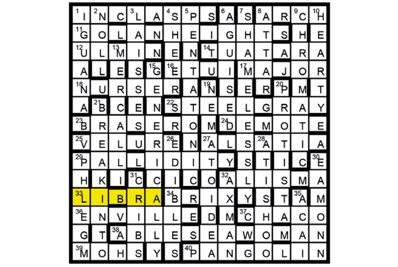 The theme word is scales: 1D, 14 and 40 are creatures with scales; 5, 9 and 17 are musical scales; 13, 34 and 39 all gave their names of scientific scales. 33 was to be highlighted.
