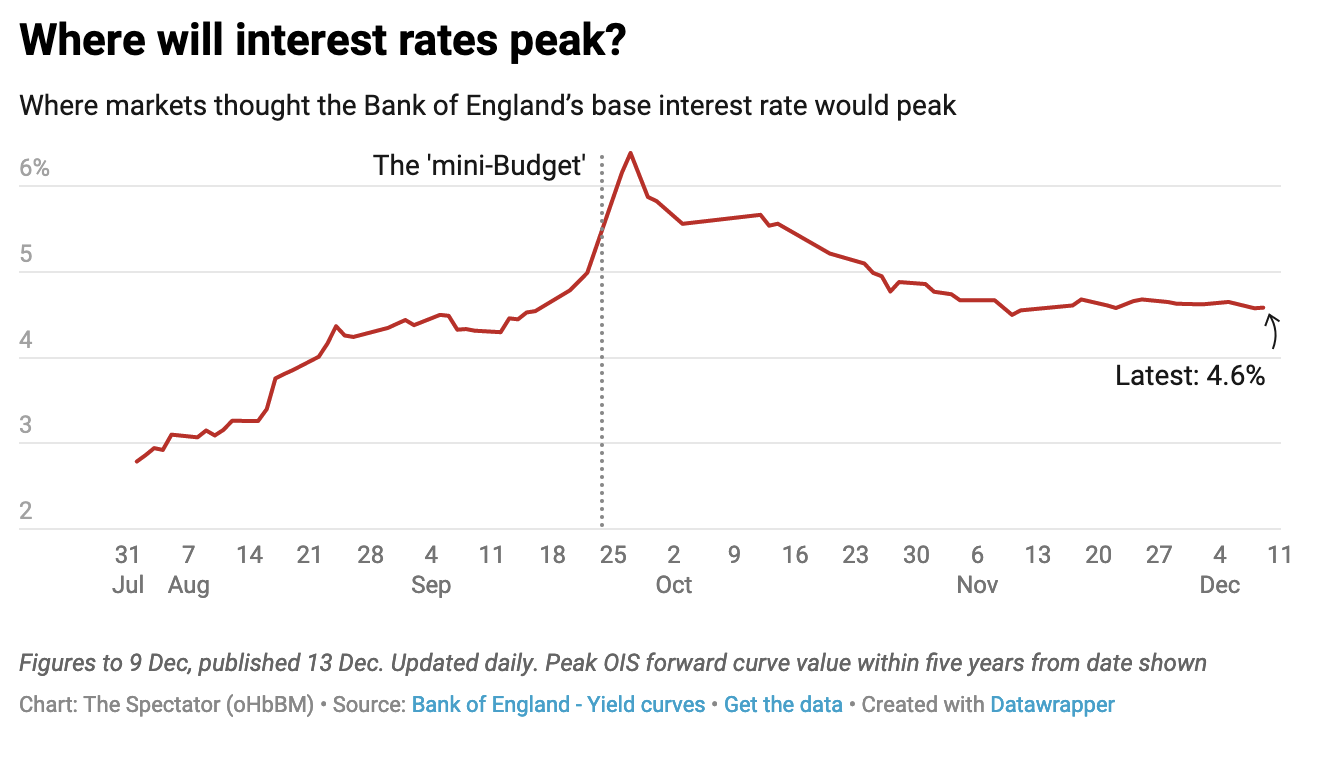 Markets are calmer than they were in the aftermath of the Kwartening ‘growth budget’ and the fall in economic inactivity will placate them further. But there’s still a long way to go. Traders still expect interest rates to peak at over 4.5 per cent, while the consensus remains that the Bank of England will raise the headline rate by at least 50 basis points at their meeting later this week. Though, given stronger than expected monthly GDP growth (0.5 per cent) yesterday and the gradual loosening of the jobs market today, a 75 basis points rise is not off the cards.