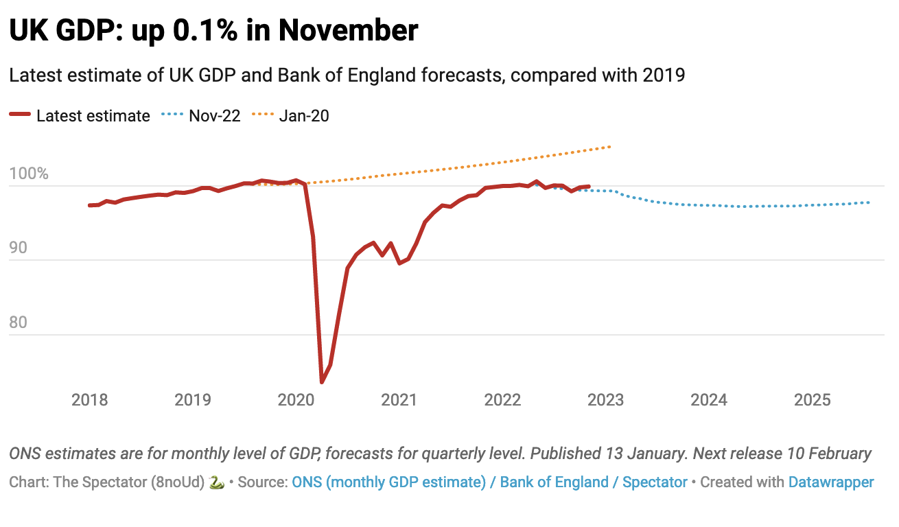 Today’s figures must, however, be read with caution. They are just a first estimate: the ONS often revises them at a later date. In the second quarter of 2022, for example, there was a very significant change, with the ONS’s revised estimate rising from minus 0.2 per cent to plus 0.1 per cent. Moreover, the economy remains smaller that it was in January 2020 on the eve of the pandemic. Last May, GDP just about crept above pre-pandemic levels, but it was not to last: the economy is now 0.9 per cent smaller than it was then. The productive sector remains in recession, with output falling by 0.2 per cent in November. Moreover, when you take into account population growth of 0.3 to 0.4 per cent per year, the fall since 2020 equates to marked fall in output per head.