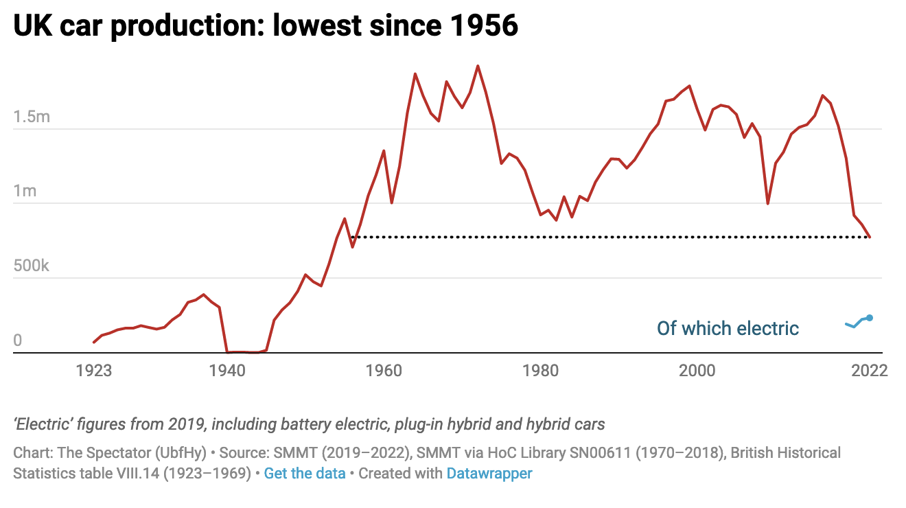 So now we know what Britain’s great green economy looks like. First, the good news: construction of electric cars in Britain increased by 4.5 per cent in 2022 to 234,066 vehicles. Now the bad news: overall car production slumped to its lowest level since 1956, with just 775,014 units rolling off the production line.
