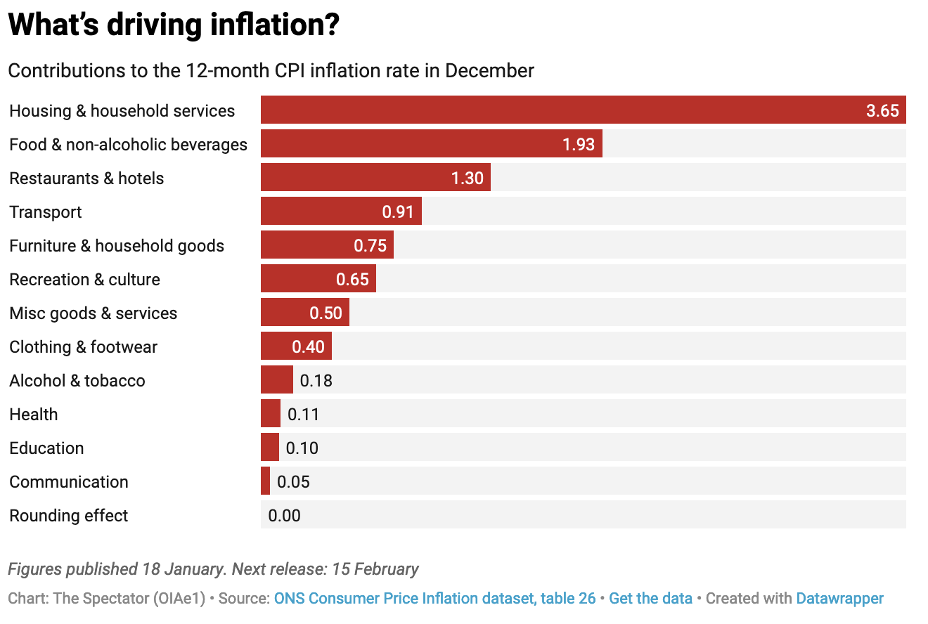 Oil prices are down, wholesale gas prices are down, so why isn’t inflation falling a lot faster than it is? The Consumer Prices Index (CPI) for December, announced this morning, stood at 10.5 per cent, down from 10.7 per cent in November and 11.1 per cent in October – a welcome boost but still way, way above the Bank of England’s target of 2 per cent. Petrol and also clothing were down in price, but they were nearly cancelled out by rising food prices. Food prices in the year to December rose by 16.8 per cent, which was up on December’s 16.4 per cent.