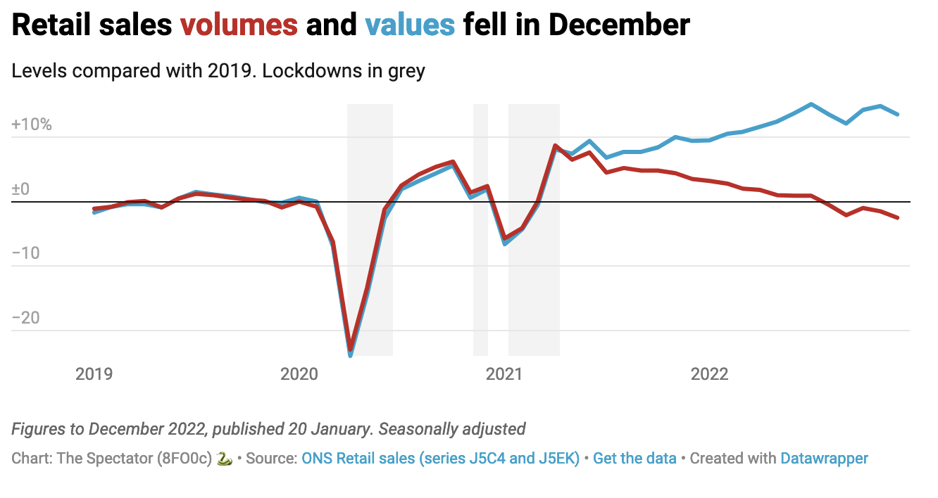So the question now is just how quickly that headline figure falls, and how much more pain is experienced along the way. While prices may be falling, other data suggests that the financial impact of both inflation and stagnant growth is catching up with consumers. Today’s retail update from the Office for National Statistics shows sales falling 1 per cent on the month in December, as the cost-of-living crunch takes its toll. Sale volumes were down for both food stores and non-food stores, suggesting more prudent spending habits across the board (and no doubt impacted by the further rise in food prices, up a staggering 16.8 per cent on the year in December).