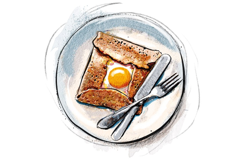 Assuming you don’t have a crèpe maker and paddle, a big non-stick frying pan and a spatula will do the job just as well. The batter is incredibly simple – a mixture of buckwheat flour, milk, egg and a little salt – but needs to be left in the fridge for at least a couple of hours, or overnight, to let the flour hydrate. Once it has rested, melted butter is added, and the batter is then cooked on one side in a hot pan, with the fillings being added on the uncooked side. As with most fast foods, you can fill the galette with whatever your heart desires (or your fridge contains): it’s pretty great just with butter (salty, as is right and proper for a Breton speciality). But the classic is a ‘galette complête’, also known as the ‘galette Bretonne’, with ham, cheese, and an egg cooked into the centre of the pancake, the four sides flipped into the middle, showing off the perfect yolk.