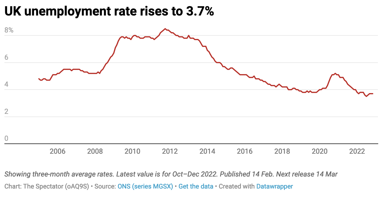 The latest labour market update – published by the Office for National Statistics this morning – looks a lot like last month’s update: that’s to say, a mixed bag of news. Unemployment rose again, up 0.1 per cent between October to December, to 3.7 per cent. But this quarterly rise was once again off-set by a fall in economic inactivity: down 0.3 percentage points, largely thanks to young workers entering (or re-entering) the workforce.