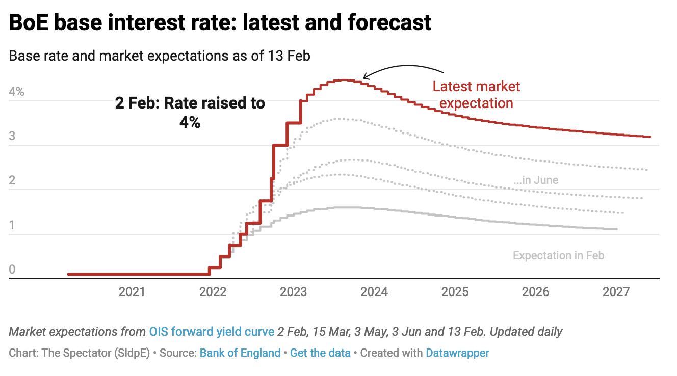 Those absent workers continue to be missed: while job vacancies fell by 76,000 between November 2022 and January 2023, the total is still at 1,134,000 – not far off the record highs we saw as the economy started to reopen after lockdowns. This tightness in the labour market continues to push up wages, resulting in ‘the strongest growth rate’ for average regular pay, coming in at 6.7 per cent, between October and December last year. Capital Economics (CE) has revised its view on interest rates this morning, based on this latest set of wage data. Now that private sector wage growth has exceeded its forecast, CE has revised its expectation for a peak interest rate of 4 per cent up to a peak of 4.5 per cent.