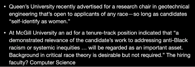 As the Economist recently noted, many academic job advertisements mandate elaborate statements about an applicant’s commitment to DEI principles, and scientific merit often comes second to political correctness and activism as a selection criterion. Some job ads explicitly exclude white males from applying, all in the name of social justice, diversity, equity, and inclusiveness.