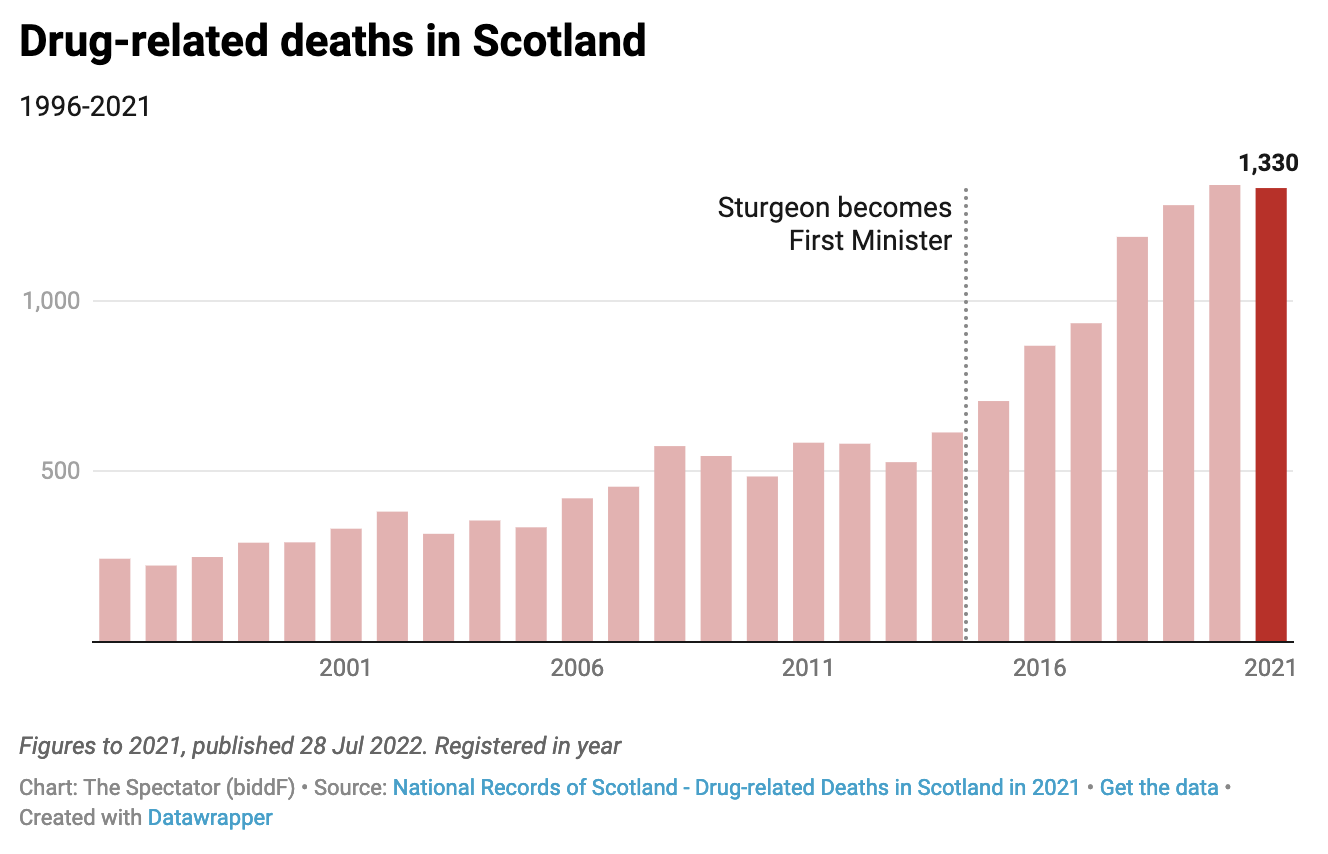 2. Drug deaths have soared in this time too. Deaths from ‘drug-related’ causes in Scotland reached record highs for seven years in a row. More people die from drug misuse in Scotland than anywhere else in the developed world. This policy area is so controversial that disputes within government agencies and Scottish academia have led to crucial reports into this being delayed. Last year the heads of Scotland’s ‘drug taskforce’ resigned because of government desires to meet targets rather than make lasting change.