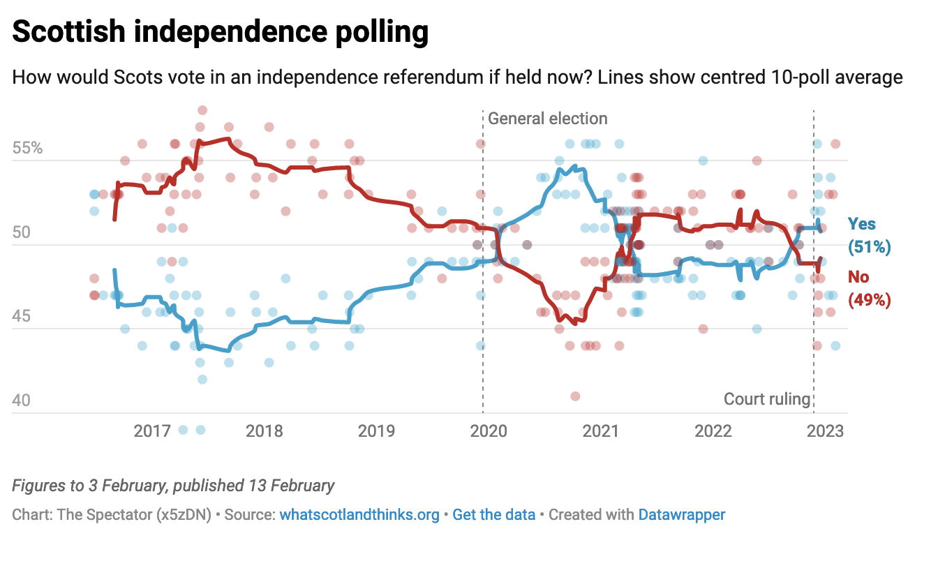 Her proclamations may regularly splash the front page of newspapers but none of this has moved the dial. Despite admirable domination of every election in Scotland since her ascension, the latest polling puts Yes back at 2019 levels, no increase on the 2014 result. Brexit, Boris, the pandemic and Partygate haven’t changed things for any meaningful period. Independence supporters are right to grow frustrated.