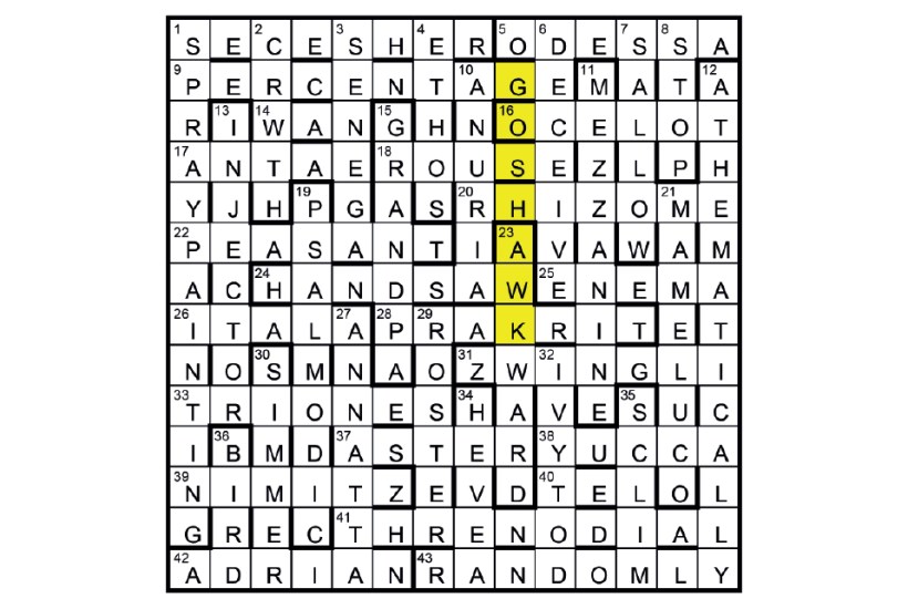 The seven unclued lights are BIRDs (36) minus one letter: (S)WAN (14), (G)ROUSE (18), P(H)EASANT (22), TE(A)L (40), S(W)ALLOW (7), R(O)OSTER (29) and S(K)IMMER (30). GOSHAWK (in the 9th column) was to be shaded. Title: cf. BI(R)D.