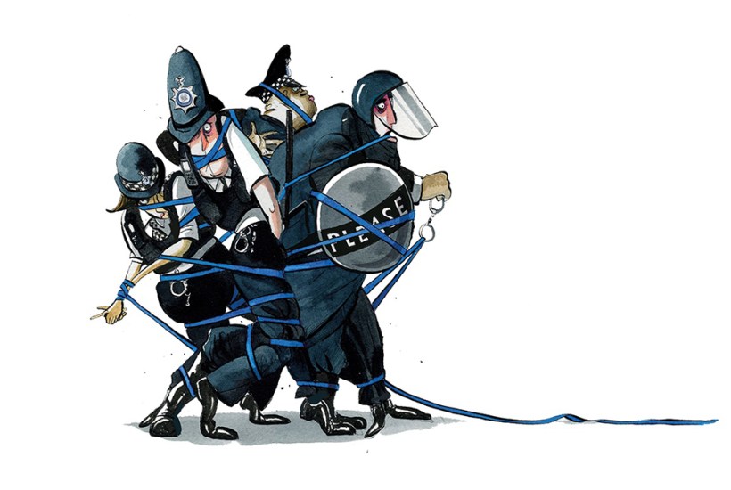As I left I passed a senior detective, and remembering my ‘greater say’ I had a polite word: why six officers for every activist? He looked cross. ‘We can’t tell how many will turn up,’ he said, then turned his back on me. I don’t think he was up to speed on Sir Mark’s listening mission. Nor was he open to my other questions like: ‘Why can’t you tell how many protestors will turn up? Don’t you check their Facebook page? And now the activists have gone, why are all the officers still standing here?’